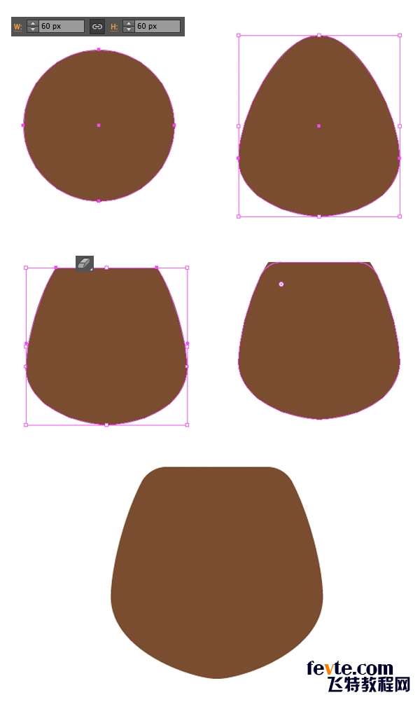 首先从一个60*60 px 的圆中制作一个熊的脸。 将2边的锚点向下移动,顶部的锚点向上移动,使其看起来像一个鸡蛋。