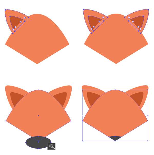 从我们浣熊图形中选取耳朵,并将其放置到狐狸头部的两边,调整颜色。 将黑色的椭圆放在脸的底部,覆盖住鼻子区域。 使用形状生成工具(Shift-M)除去脸外面的部分,形成一个黑色的尖鼻子。