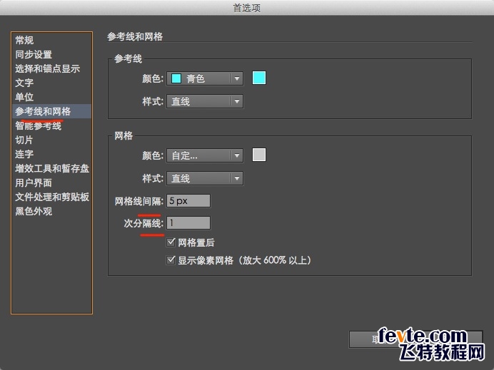 打开首选项>参考线和网格,网格间距线5px ,次分割线1。记下网格线的开启/关闭的快捷键,方便关闭网格线观察创作。