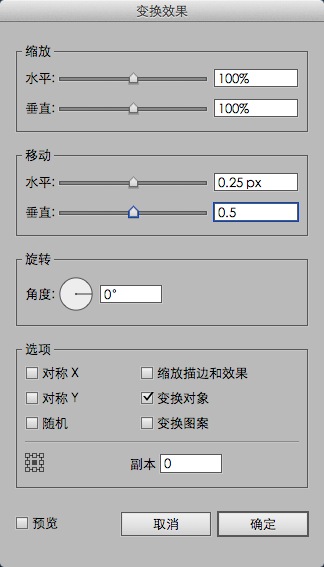 选择所有白色路径,Cmd+G编组他们。选择该编组 效果>扭曲和变换>变换,设置如下。