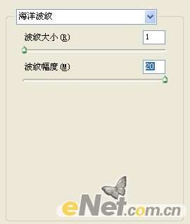 3.在选择“效果” “扭曲” “海洋波纹”命令,打开面板,在面板中设置如图3所示的参数,得到如图4所效果。
