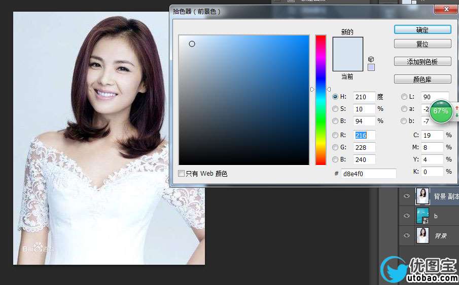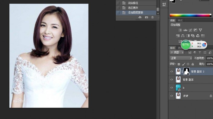先复制两层,在加入一个背景图层,在子上面的图层用钢笔工具抠图,如下