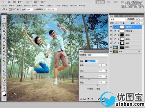 14、添加可选颜色调整层,分别调整画面中的红色、黄色、绿色、青色、蓝色、白色、黑色,将画面色彩详细调整一下,主要是天空的色彩,如图所示。