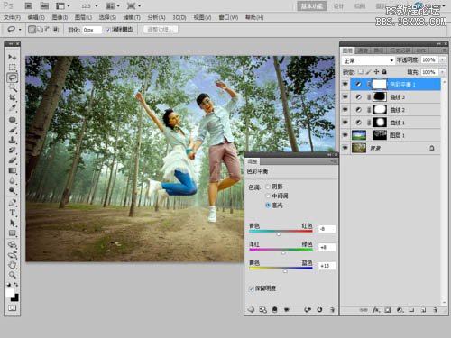 13、添加色彩平衡调整层,分别调整画面的高光、中间调、暗部的色彩,如图所示。