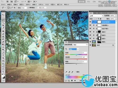 15、添加色相/饱和度调整层,将天空、树叶、皮肤的色彩饱和度进行一下调整,如图所示。