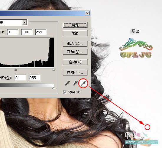 03、在图层1执行图像--调整--色阶命令,用白吸管在图中的红圈处点一下,这样原来的蓝灰色的背景就变成了白色的背景了。见图03