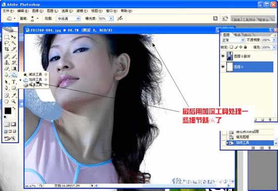 图11:再用加深工具(像一只半合拢的手)处理一些细节,使分散的发丝颜色深一些