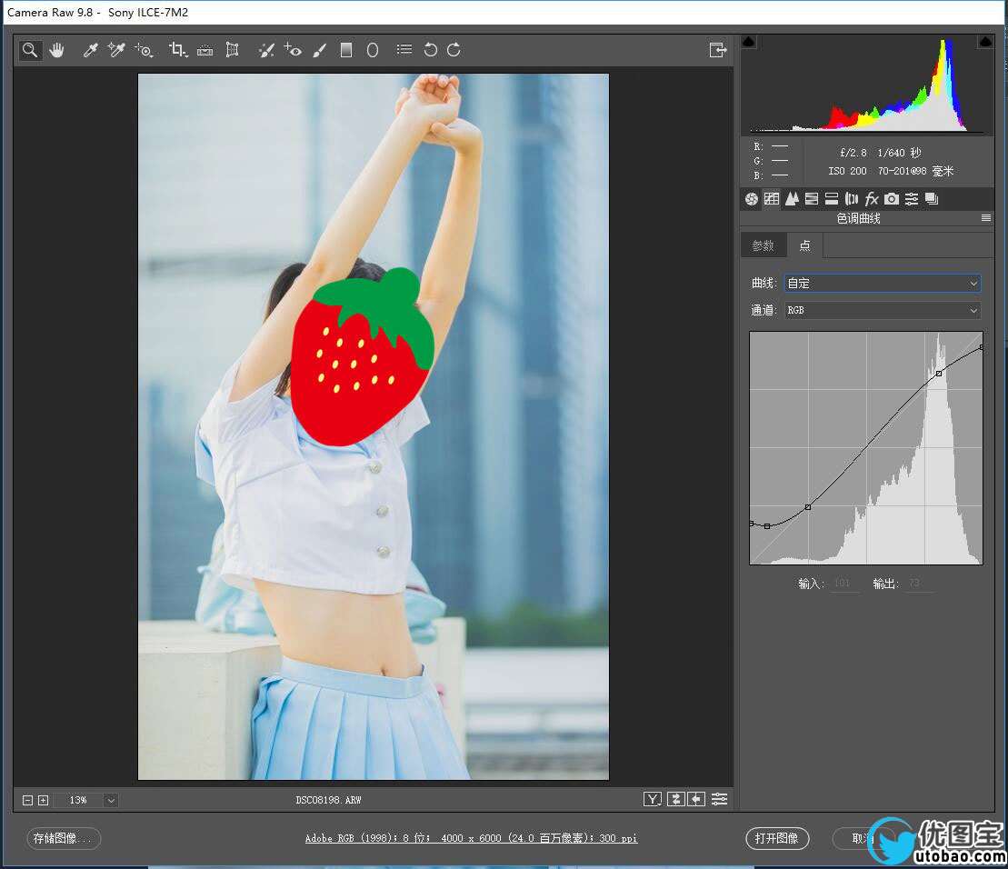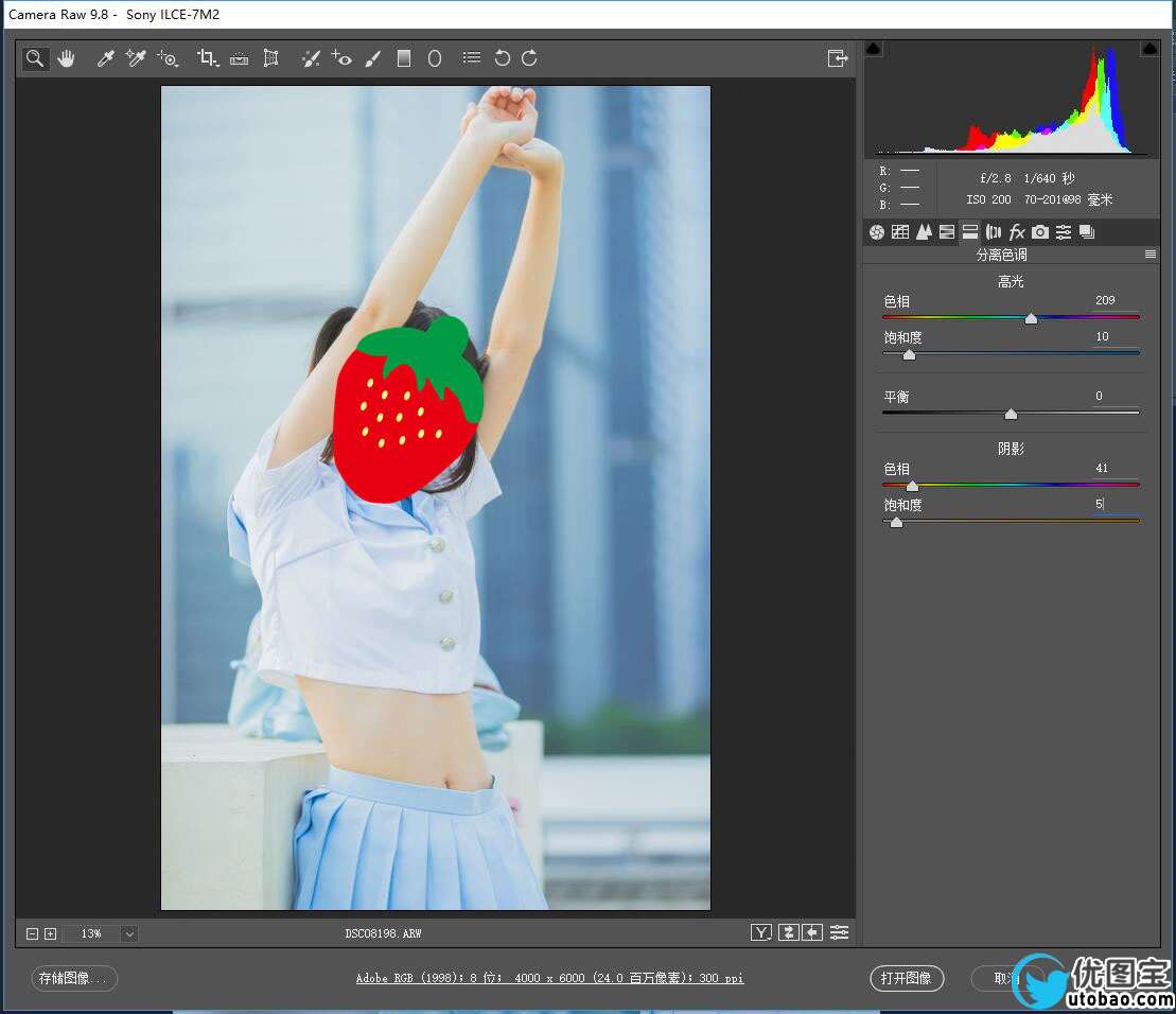 首先,我们打开RAW源文件(在PS的ACR插件上),嗯,索尼的原片黄得发慌,这图要是给妹子看到了