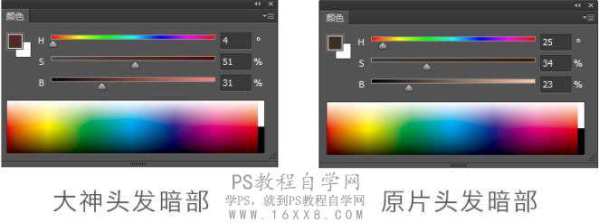 第一步:对比大神的作品,和我们的原片。你可以分析出来,大神作品的颜色,色相是在橙色里面,饱和度是比较低的,明度相对要高。如果你肉眼观察不出来。可以F6一下拿吸管吸取一下颜色去对比!我们这里找三个点就可以分析出来我们调片思路!