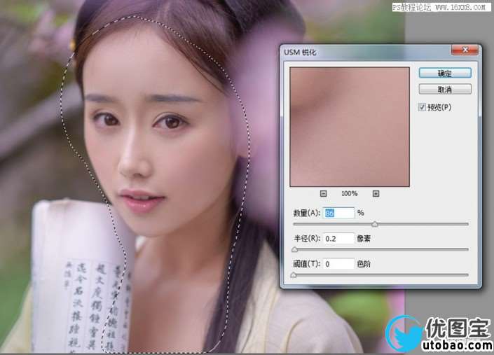 03 将上一步处理好的图片导出后,再次用“套索工具”选取出脸部区域的皮肤,然后执行“滤镜>锐化>USM锐化”命令,在弹出的对话框中设置数量为86%,半径为0.2像素,设置完成后单击“确定”,给皮肤增加一定的细节(具体数据可根据各种不同情况灵活变动)。