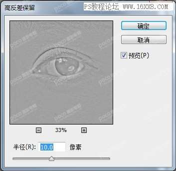 03 接着上一步,复制一层“蓝色通道”图层,然后执行“菜单栏>滤镜>其他>高反差保留”命令,在弹出的对话框中设置半径为10像素,就得到了一个类似浮雕的界面效果。