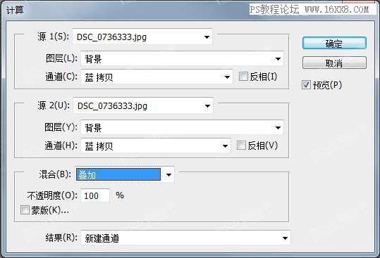 04 执行“菜单栏>图像>计算”命令,在弹出的对话框中设置“混合”模式为“叠加”,单击“确定”后会出现一个Alpha 1通道,然后反复执行该操作3~4次,叠加次数越多,效果就越明显,直到能明显看到皮肤的纹理和斑点,即可停止操作。