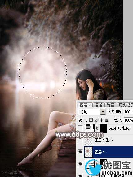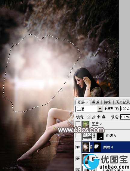 11、按Ctrl + J 把当前图层复制一层,把蒙版填充黑色,然后用透明度较低的柔边白色画笔把下图选区部分擦出来,效果如下图。这几步给图片中间微调增加较亮的烟雾效果。
