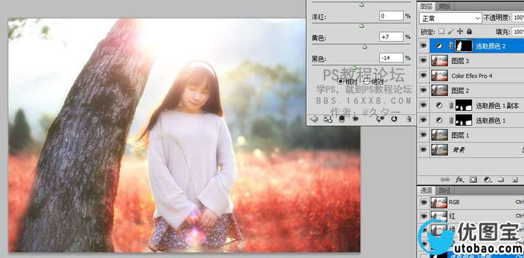 发现树干太黑,点图像~调整~可选颜色,黑色里减一点黑色加一点黄,OK,调整到此结束,是不是很简单呢?