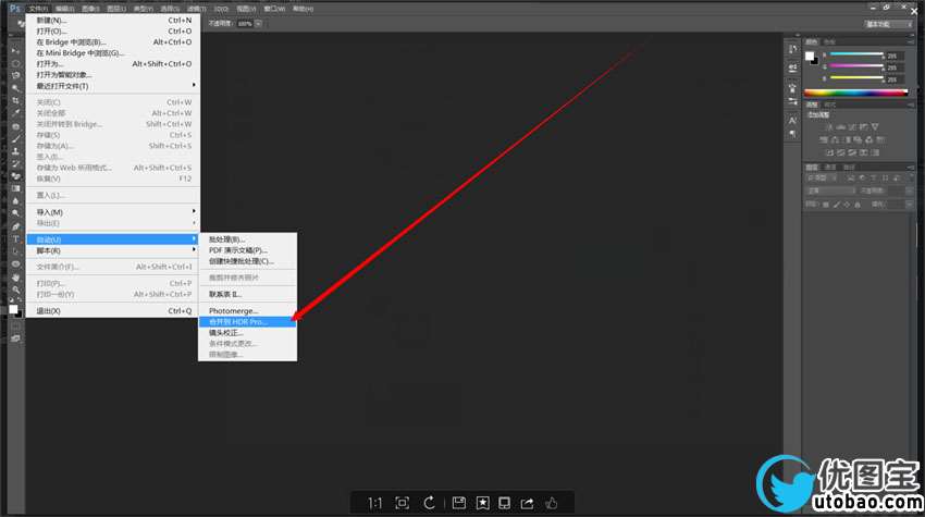 打开PS之后,我们在启动界面找到,文件->自动->合并到HDR PRO,如下图