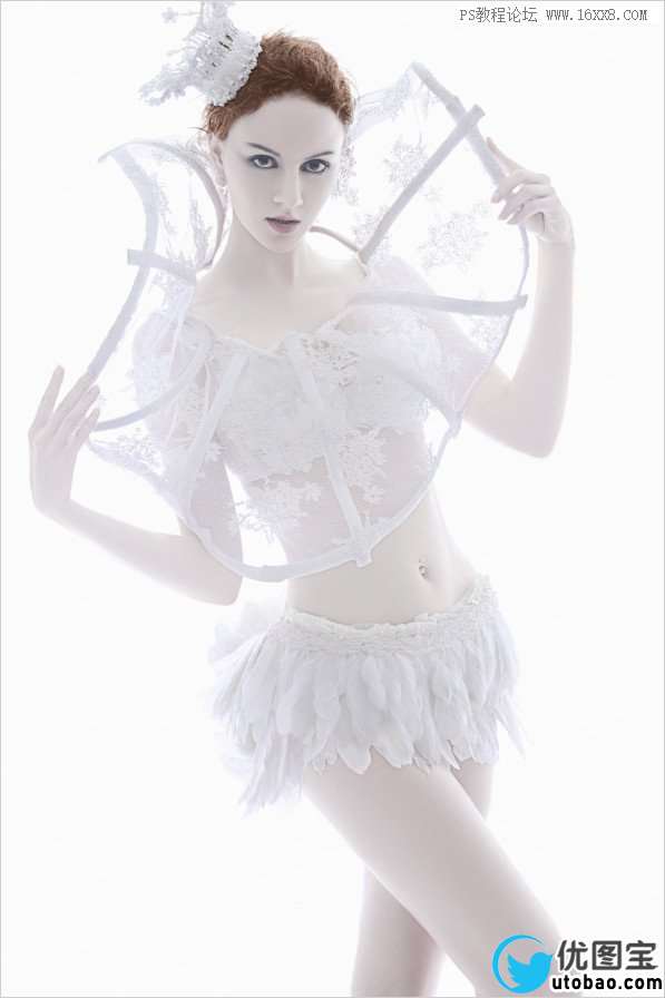 雪颜冰肌,绝世独立。大致完成冰雪女王的塑造,还需适当增加皮肤对比度更多体现透感,减淡唇色加以饱和等细节完善做好就可以了。