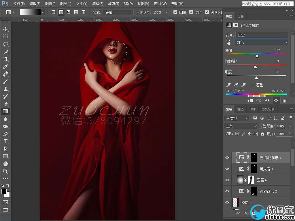 16:局部偏红,色相饱和度-红色(色相+2,饱和度-4)