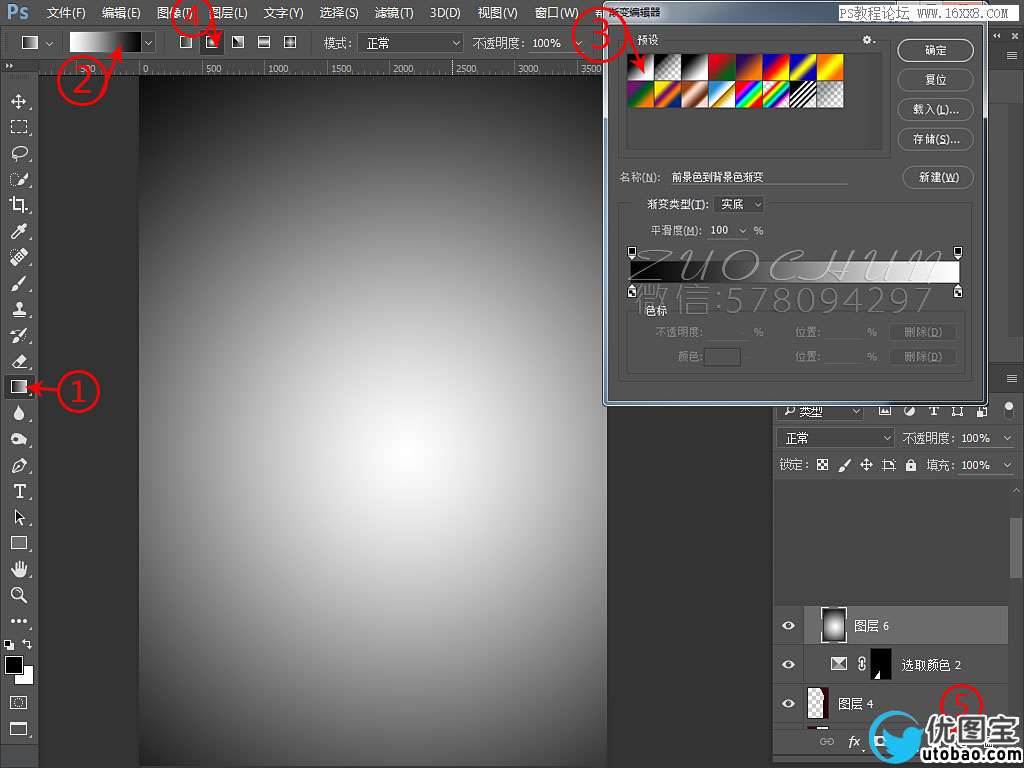 13:四周压暗,方法很多种,这个方法稍微复杂点,①选择渐变工具,②点击渐变条,③选择第一个黑白渐变(如果第一个不是黑白渐变,那就是前景色和背景色不是黑和白色),④选择第二个渐变(已一个点的方式渐变),⑤点击,新建空白层,绘制吧,(点图片中间往右下角拉下,我拉了好几次)。
