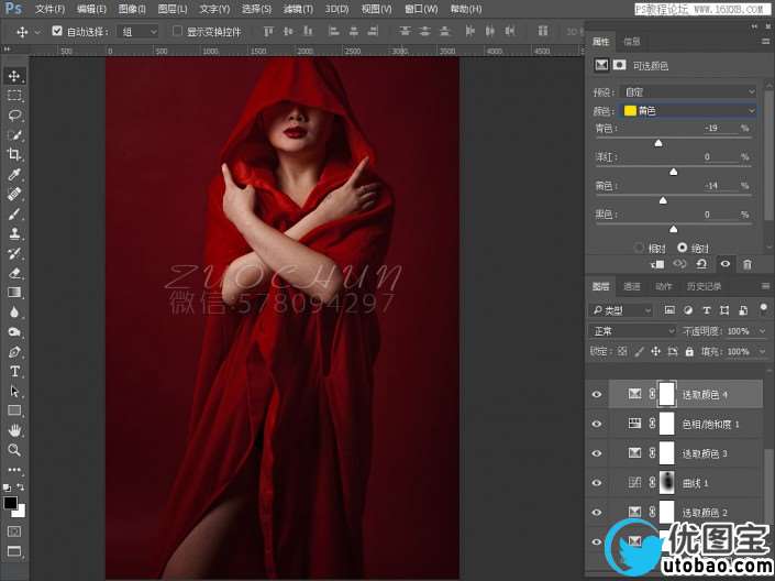 2:把背景洋红调成红色,可选颜色-洋红(青色-12,洋红-17,黄色+48,黑色-19)