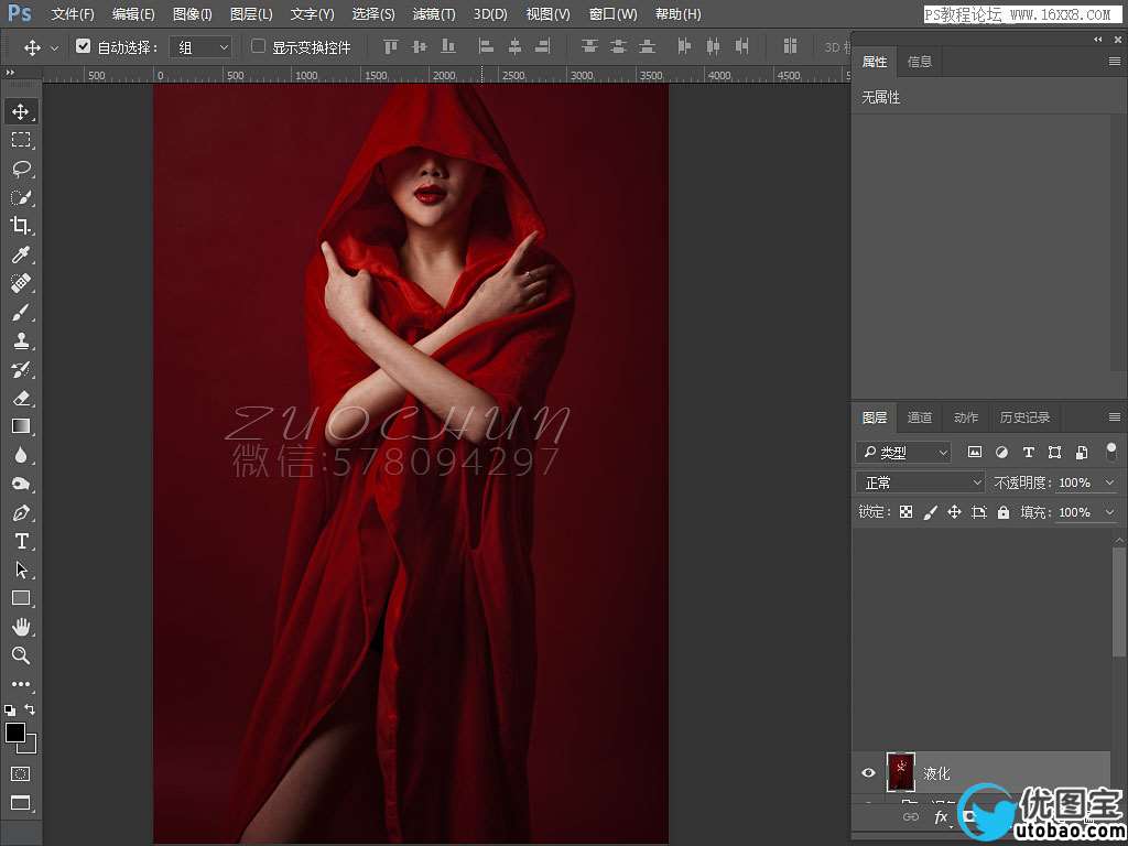 今天这个调色教程是内景红色背景,我比较喜欢暗深红,暗调会给人一种神秘的感觉,根据照片定颜色,颓废,另类,前卫,或者体现层次感可以使用暗调,人物的液化在今天的教程也是一个亮点, 这张照片看不到脸,一定要把脸型和身材,衣服的走向液好,正因为看不到脸所以更体现了照片整体的神秘感,开始调色吧。