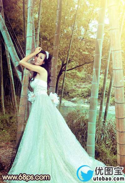 素材图片的背景仅为绿色,有点单一。处理的时候可以把高光和暗部的颜色分出来,分别调成黄色与褐色。也可以按照自己的喜欢选色。主色出来后,稍微美化一下人物,渲染一下高光即可。