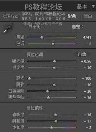 根据分析,在基本调试里适当加一些曝光,再减淡高光,提高清晰度让照片加点质感,其他数值也根据个人喜好微调。