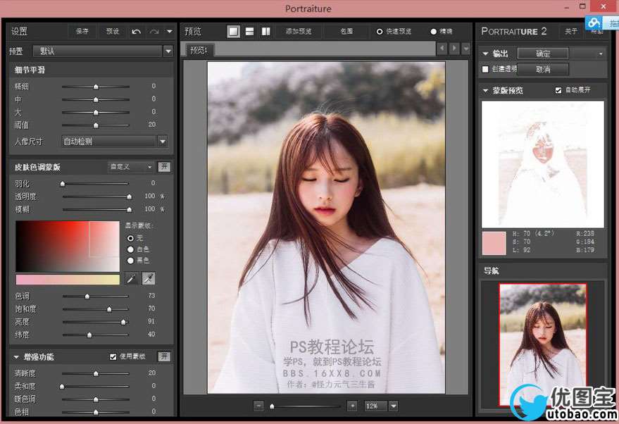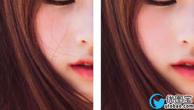 然后使用中性灰或高低频磨皮法对皮肤进行处理,同时用修复画笔工具去除模特脸上的发丝,最后再用磨皮插件Portraiture过一遍。