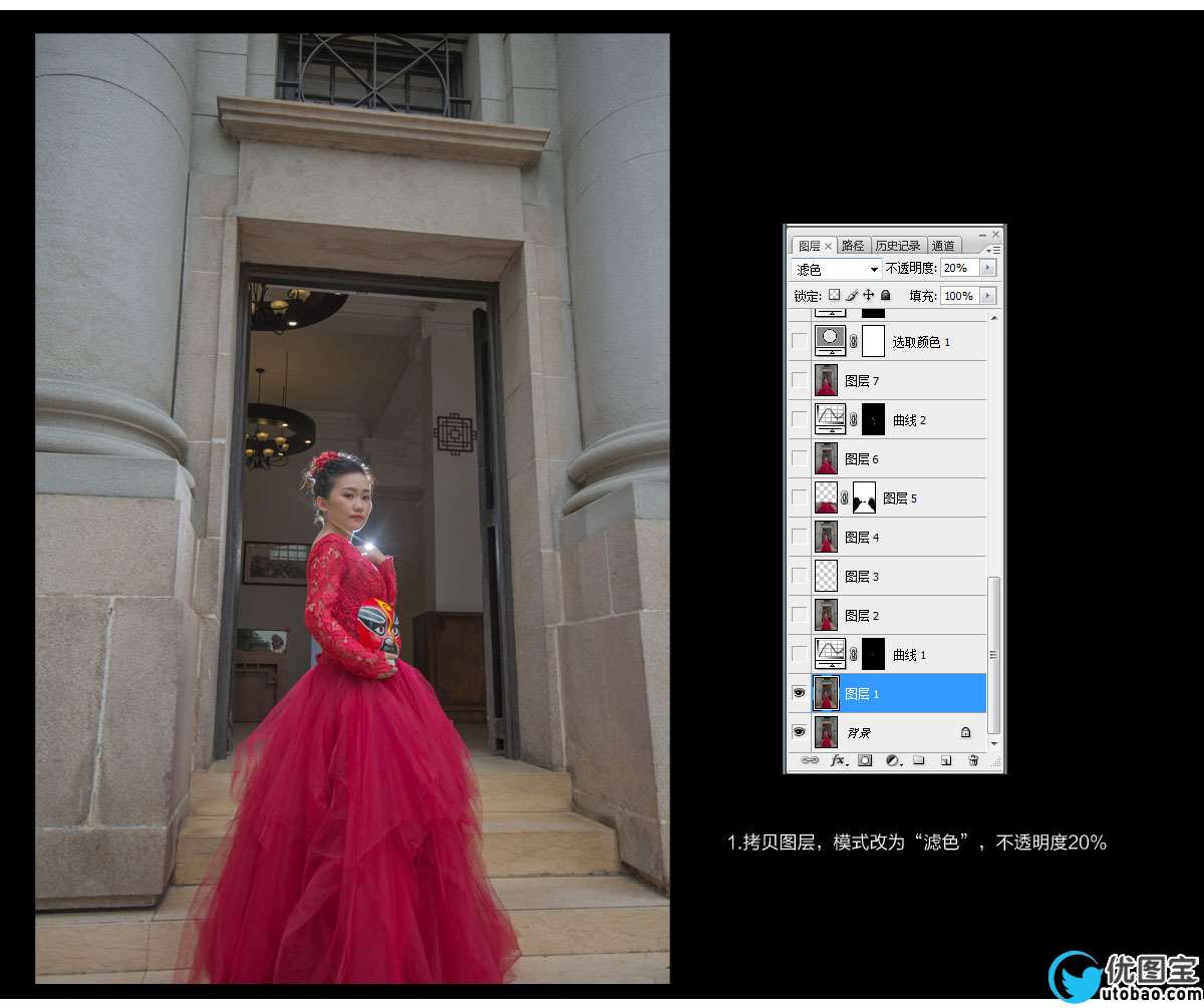 1、拷贝图层,模式改这滤色,不透明度20%。
