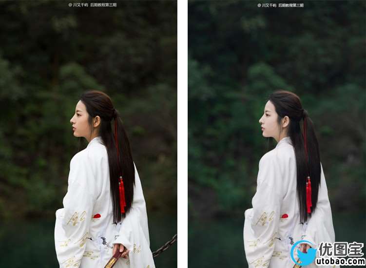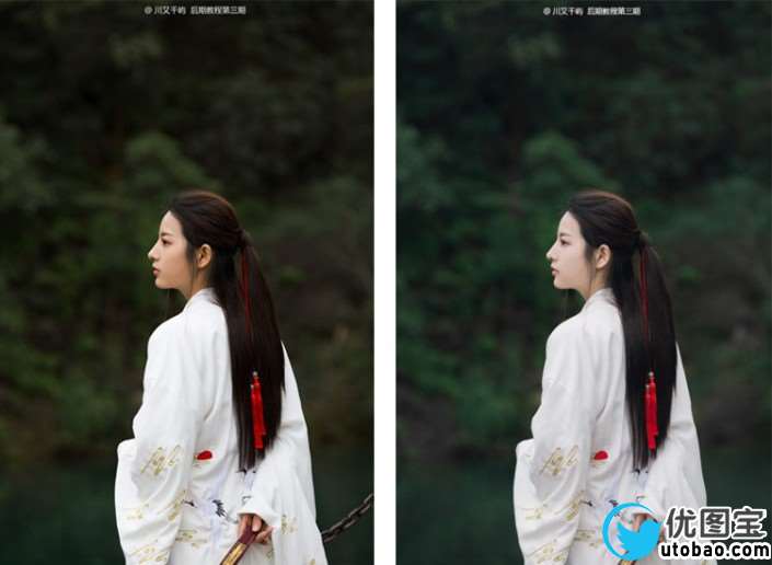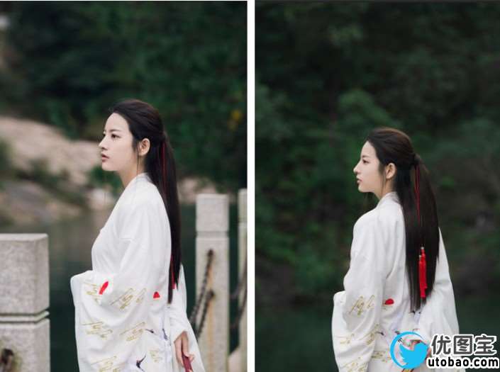 原片分析:1、曝光不足,整体画面偏暗;2、模特肤色偏黄不通透;3、水面跟树木颜色有明显层次区分影响视觉效果;4、链条和背景的黄色杂色显得突兀。