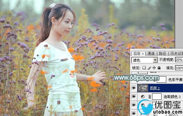 11、新建一个图层,按字母键“D”把前,背景颜色恢复到默认的黑白,然后选择菜单:滤镜 > 渲染 > 云彩,确定后把混合模式改为“滤色”,不透明度改为:20%,效果如下图。这一步增加图片亮度。