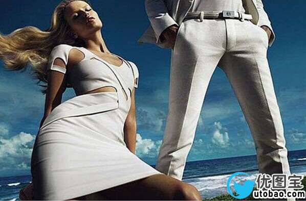 本期选择的参考片是Gucci 春夏广告样片。照片多采用低角度拍摄,运用大幅度的肢体动作和夸张的镜头语言实现强烈的视觉冲击力。画面延续了湛蓝泳池的色彩风格,对大面积的天空、海面做了强烈的色彩渲染;人物肤色洋溢着海岸阳光味道的健康小麦色,富有魅力。