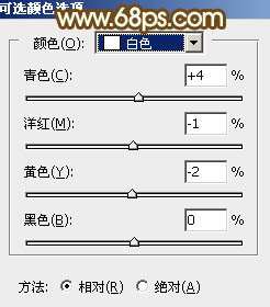 13、创建可选颜色调整图层,对白色进行调整,参数及效果如下图。这一步加强图片高光部分的颜色。