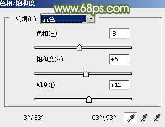 5、再创建色相/饱和度调整图层,对黄色进行调整,参数及效果如下图。