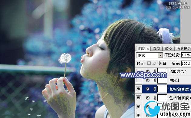 3、创建色相/饱和度调整图层,对黄色,绿色进行调整,参数设置如图6,7,效果如图8。这一步快速把图片中的黄绿色转为青蓝色。