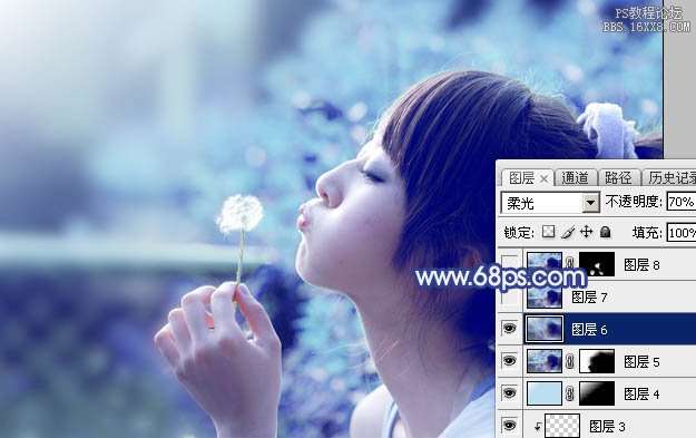 12、创建纯色调整图层,颜色设置为淡蓝色:#DBEDF8,确定后把蒙版填充黑色,用白色画笔把左上角部分擦出来,效果如下图。