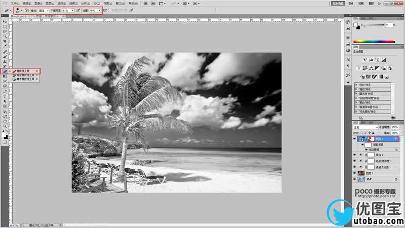使用径向滤镜之后我们的画面整体都会变得模糊,但是我们想要的是前景清晰,后期模糊。于是我们可以在黑白图层上添加蒙版,然后使用橡皮擦工具,调整合适的参数擦去前景。