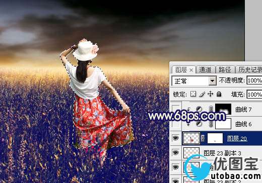 13、按Ctrl + J 把当前图层复制一层,创建剪切蒙版后效果如下图。这两步把天空顶部区域压暗。