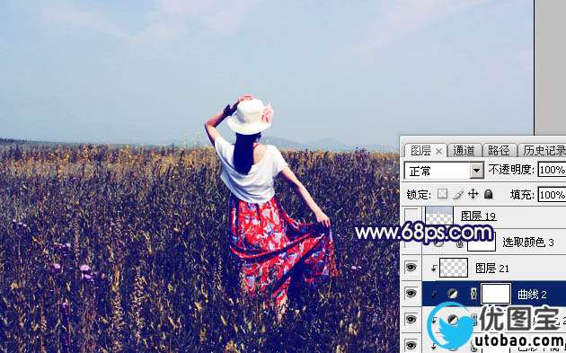 27、按Ctrl + Alt + 2 调出高光选区,创建曲线调整图层,对RGB、红、绿、蓝通道进行调整,参数设置如图50 - 53,效果如图54。这一步给图片高光区域增加淡蓝色。