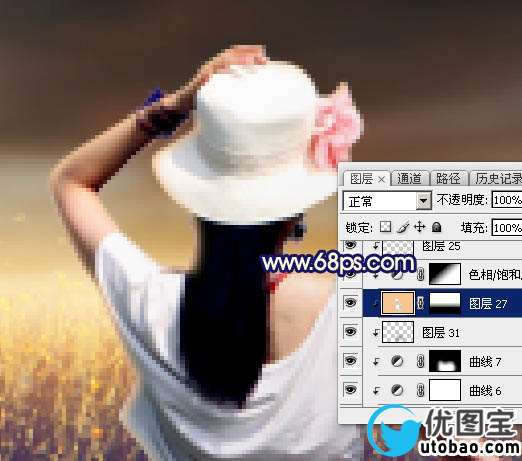 15、创建色相/饱和度调整图层,适当降低全图,红色饱和度,参数设置如图32,33,确定后创建剪切蒙版,效果如图34。