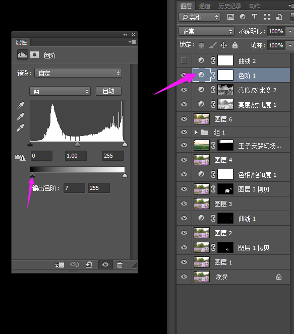 最后调色阶段,一步:色阶,蓝通道暗部+7 红通道暗部+7红 蓝+红为洋红,高光不动。加色完毕。
