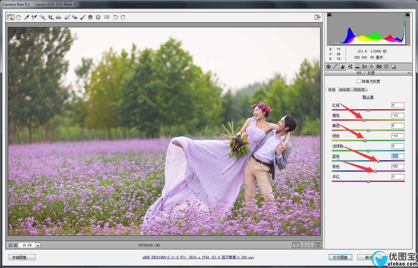 随后我们跳转至HSL/灰度 对图像中单一色彩进行单通道调节。在讲到这里时,我不得不提醒大家一点的是,你们认为薰衣草应该是什么颜色才好看?