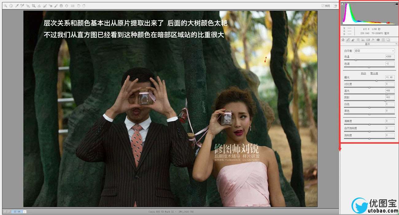 层次关系和颜色基本从原片提取出来了,后面的大树颜色太艳,不过我们从直方图已经看到这种颜色在暗部区域占的比重很大。
