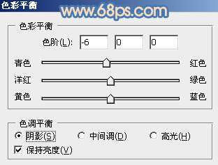 10、创建色彩平衡调整图层,对阴影,高光进行调整,参数设置如图22,23,效果如图24。这一步增加暗部及高光部分的蓝色。
