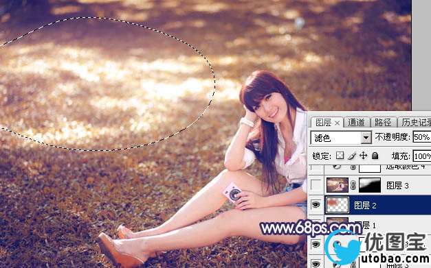 16、用椭圆选框工具拉出下图所示的选区,羽化45个像素后填充橙黄色:#FCE759,取消选区后把混合模式改为“柔光”,不透明度改为:50%,效果如下图。