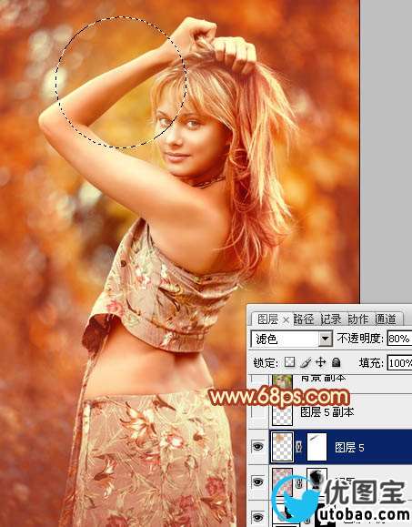 12、新建一个图层,选择椭圆选框工具,拉出下图所示的椭圆选区,羽化30个像素后填充橙黄色:#D18934,混合模式改为“滤色”,不透明度改为:80%,效果如下图。这一步给图片增加高光。