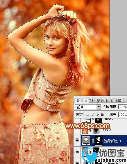 2、按Ctrl+ J 把当前可选颜色调整图层复制一层,用黑色画笔把图片的中间部分擦出来,如下图。这一步增加图片的橙红色,中间部分涂出来可以更好的增加图片的色彩过渡。
