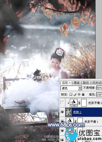 9、新建一个图层,按字母键“D”把前,背景颜色恢复到默认的黑白,再选择菜单:滤镜> 渲染 > 云彩,确定后把混合模式改为“滤色”,不透明度改为:50%,效果如下图。