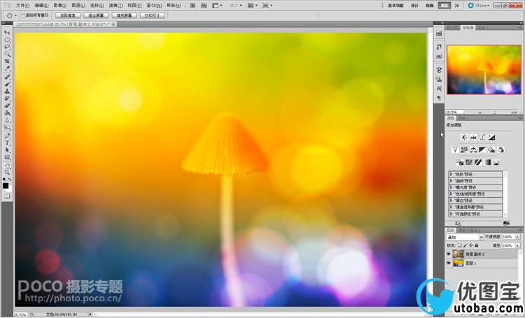 选取一张色彩丰富,有虚焦光斑的背景,放在主图的图层下面。