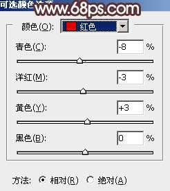 4、创建可选颜色调整图层,对红、黄,黑进行调整,参数设置如图10- 12,效果如图13。这一步同样给图片增加橙黄色。
