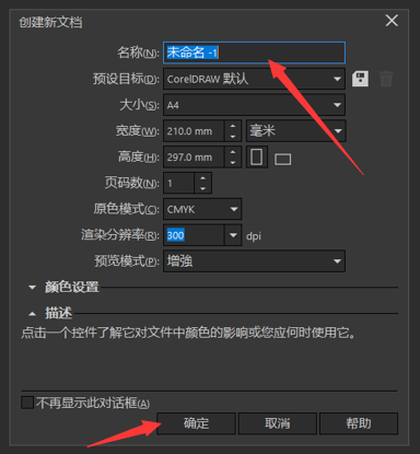 第一步,在CorelDRAW制作logo之前,我们先在CorelDRAW创建一个新文档。无特殊要求参数可以就用程序的默认值。将名词修改后点击确认。